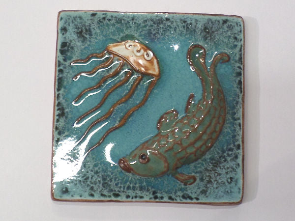 Ann Mari Hopkins - Fish and Jelly fish ceramic tile, approximately 10cm x 10cm